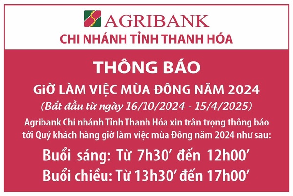 Đây là giờ làm việc công bố và cũng là giờ mở cửa hoạt động đón khách hàng của Agribank. Tuy nhiên, tại một số điểm giao dịch, giờ hoạt động buổi chiều có thể kết thúc sớm hơn vào lúc 16h30.