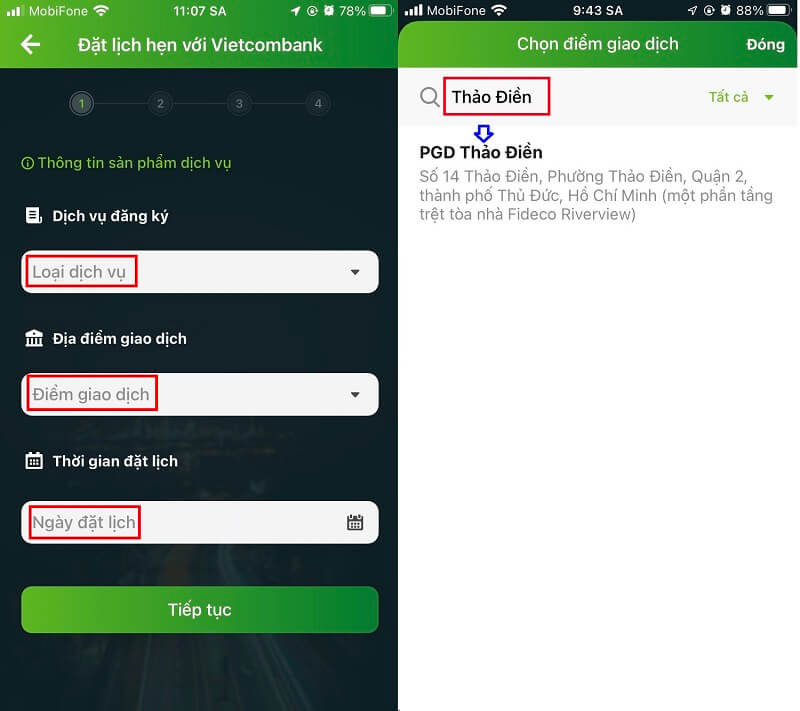 - Địa điểm giao dịch: Quý khách gõ chữ Thảo Điền vào ô tìm kiếm, sau đó nhấn chọn PGD Thảo Điền. Nếu điền sai thì nhấn vào nút trở lại để điền cho chính xác nhé.