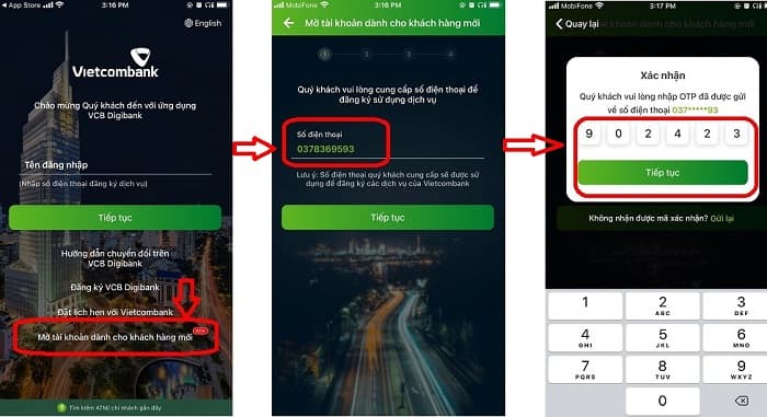 Bước 2: Truy cập vào ứng dụng Mobile Banking VCB, đăng ký bằng số điện thoại, chọn mật khẩu 8 ký tự.