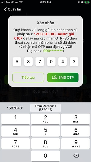 Bước 3: Sau khi đăng nhập xong VCBDigbank bạn tiến hành xác nhận: “Mã OTP”.